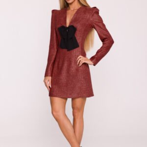 Wyjątkowa sukienka z tkaniny tweedowej w melanżowym wzorze to elegancka propozycja z nutą nowoczesnego charakteru. Strukturalny materiał pięknie układa się na sylwetce, nadając całości szyku i klasy. Model ma głęboki dekolt w kształcie litery V, który subtelnie podkreśla kobiecą sylwetkę. Długie rękawy z lekko poszerzanymi ramionami i bufkami dodają sukience wyrazistości oraz nadają jej modnego, strukturalnego charakteru. Zapięcie na kryty zamek z tyłu zapewnia wygodę i estetyczne wykończenie. Wyjątkowym detalem jest ozdobna dopinka, szyfonowa kokarda z biżuteryjnym wisiorkiem, która nadaje sukience eleganckiego, biżuteryjnego akcentu i sprawia, że prezentuje się jeszcze bardziej wyjątkowo. Fason lekko dopasowany z mocniej zaznaczoną talią podkreśla proporcje sylwetki, a mini długość dodaje całości lekkości i kobiecego uroku. Zaprojektowana i uszyta w Polsce idealna dla kobiet, które cenią klasykę z nowoczesnymi, dekoracyjnymi detalami.
