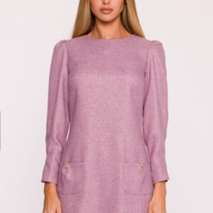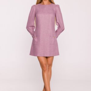 Elegancka sukienka z tkaniny tweedowej w melanżowym wzorze to propozycja łącząca klasyczny szyk z dziewczęcym wdziękiem. Strukturalny materiał pięknie układa się na sylwetce, a jego charakterystyczna faktura nadaje całości wyrazistego stylu. Model z dekoltem w kształcie łódki i długimi rękawami marszczonymi na ramionach prezentuje się subtelnie i kobieco. Zaszewki u dołu rękawów dodają im eleganckiej formy, a kryty zamek z tyłu zapewnia wygodę i estetyczne wykończenie. Na przodzie umieszczono naszywane kieszenie ozdobione biżuteryjnymi kokardkami, które przełamują klasyczną linię fasonu i wprowadzają efektowny, dekoracyjny akcent. Trapezowy krój, delikatnie dopasowany w ramionach i swobodny w biodrach, gwarantuje komfort noszenia i piękną, harmonijną sylwetkę. Mini długość nadaje sukience lekkości i nowoczesnego charakteru. Zaprojektowana i uszyta w Polsce idealna dla kobiet, które cenią elegancję z nutą oryginalnych detali.