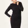 Rozkloszowana sukienka z dzianiny. Fason luźny. Dekolt w łódkę. Przód sukienki z eleganckimi cięciami francuskimi, podkreślającymi kobiece kształty.