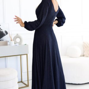Suknia NELA marki Numoco to elegancka, długa kreacja z rozcięciem na nodze i luźnymi długimi rękawami. Sukienka posiada dekolt w kształcie litery V z przodu oraz zmysłowy dekolt na plecach. Wykonana z błyszczącego, granatowego elastycznego materiału, który doskonale podkreśla sylwetkę. Produkt polski, idealny na wyjątkowe okazje.