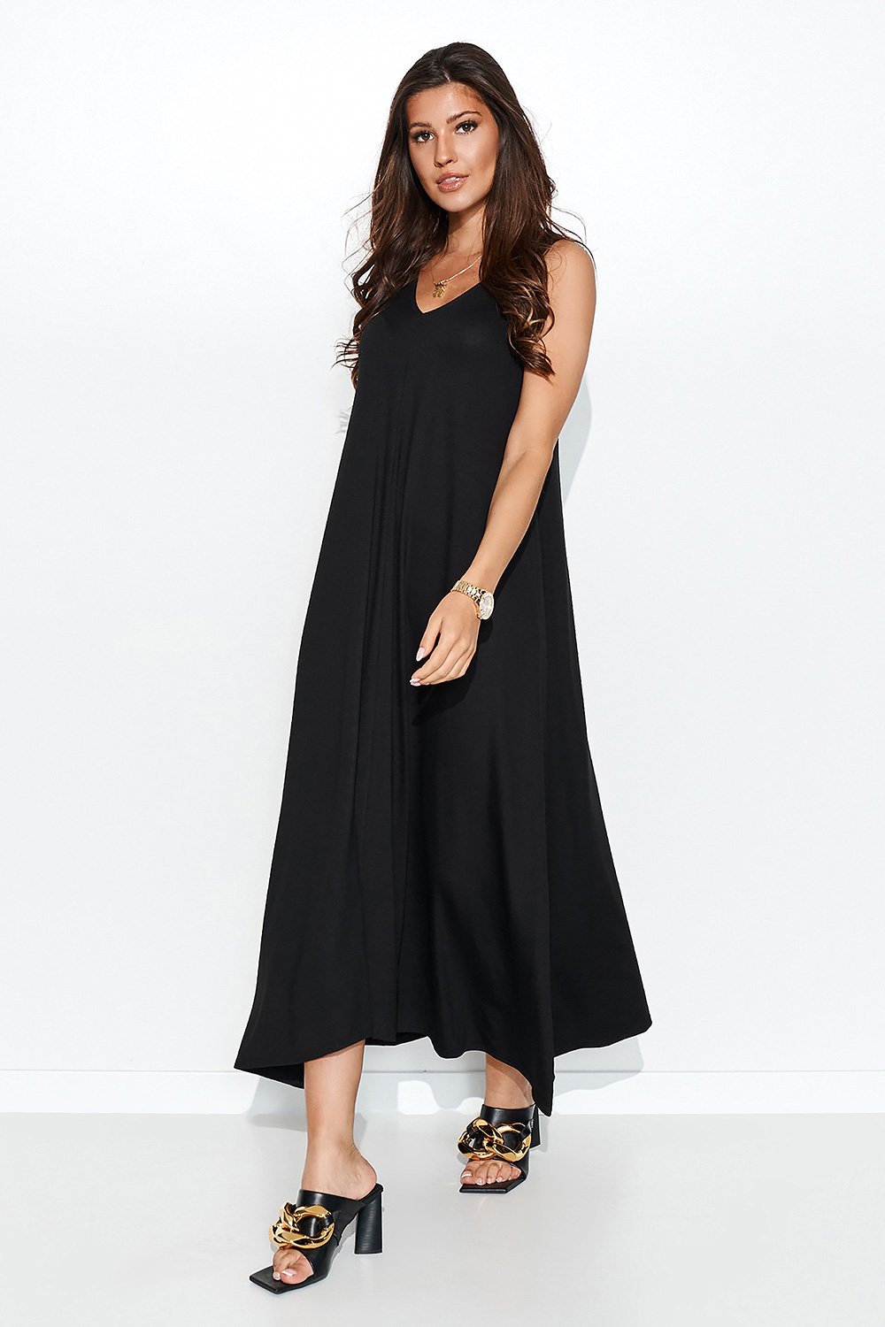 Długa sukienka bez rękawów uszyta jest z przyjemnej w dotyku dzianiny. Sukienka posiada klasyczny fason, dzięki czemu będzie się świetne prezentować na wielu kobiecych sylwetkach. Jedynym elementem ozdobnym tej sukienki jest delikatna aplikacja wszyta z tyłu, w górnej części. Sukienka przepięknie eksponuje plecy dzięki mocnemu wycięciu w kształcie odwróconego trójkąta. Z przodu dekolt jest nieco mniejszy, jednak w dalszym ciągu na tyle widoczny, aby podkreślić łabędzią szyję oraz delikatne obojczyki. Sukienka jest delikatnie asymetryczna, nieco dłuższa z boku. Załóż do tej sukienki ulubione sandały, sięgnij po drobny łańcuszek i prezentuj klasę połączoną z wyrafinowaną kobiecością.