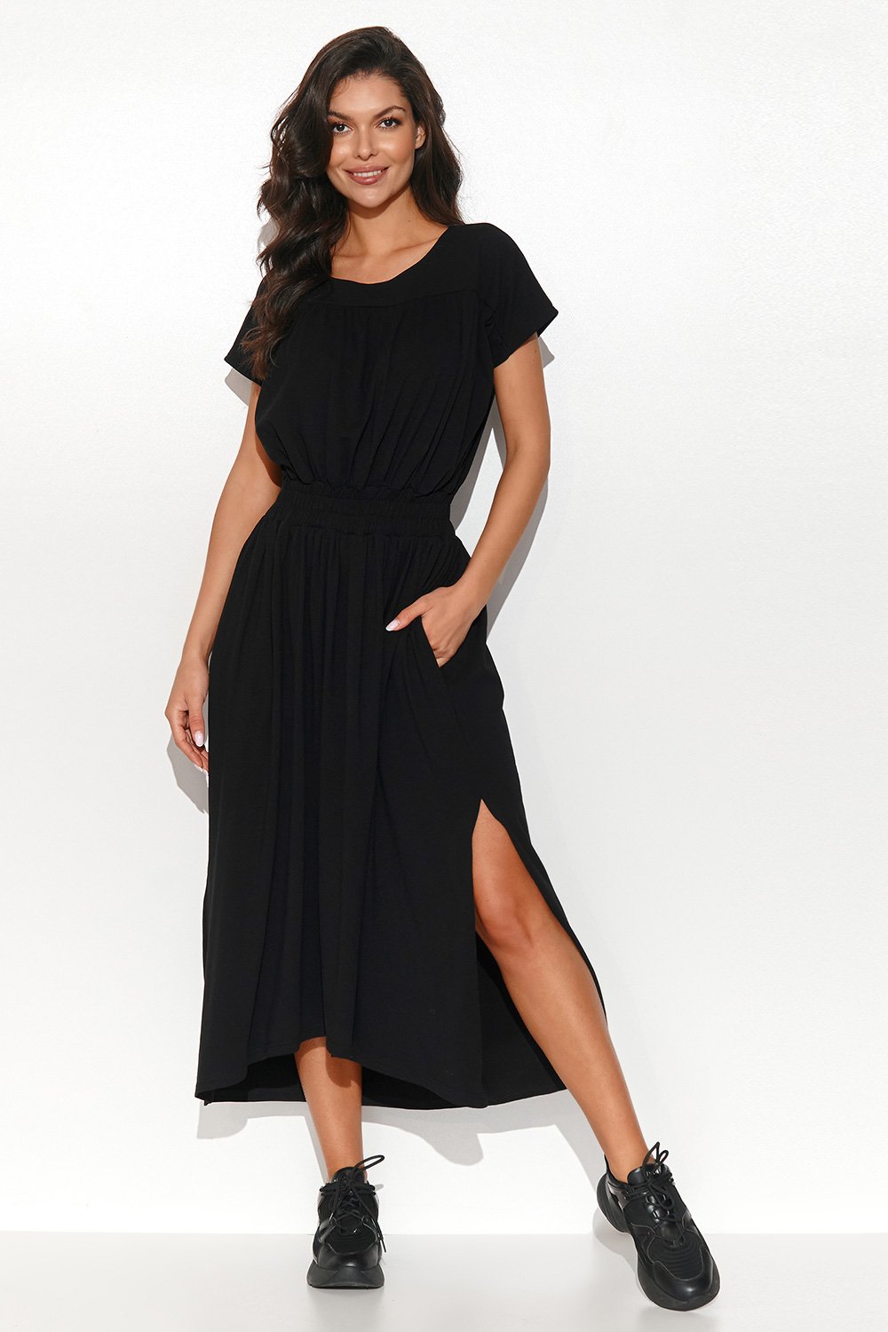 Długa sukienka asymetryczna uszyta z dzianiny dresowej. Posiada okrągły dekolt, w talii ma umieszczoną gumę ściągającą. Tył sukienki jest nieco dłuższy od przodu, dzięki czemu casualowa kreacja ciekawie prezentuje się na sylwetce. Prawie na całej długości sukienka posiada delikatne drapowania. Po bokach zostały wszyte boczne kieszenie wsuwane. Okrągły dekolt pozostawia przestrzeń na piękny łańcuszek. Z kolei krótkie rękawy maskują ramiączka od bielizny. Załóż do niej ulubione botki lub sandały i ciesz się swobodą, zadając przy okazji szyku.
