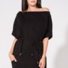 Sukienka z dzianiny o szerokim fasonie. Dekolt w kształcie litery V. Dół oraz rękawy pozostawione w stanie surowym. Tył delikatnie przedłużany. Dekolt wykończony obłożeniem.