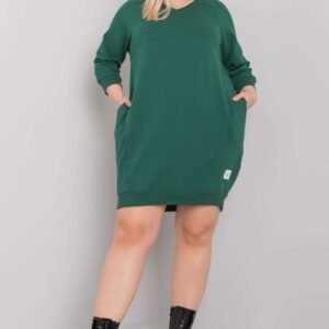 Ciemnozielona sukienka plus size z kieszeniami oraz rękawem 3/4.
