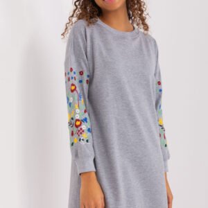 Sukienka dresowa z okrągłym dekoltem oraz długim rękawem. Rękawy ozdobione ciekawym haftem na całej długości. W szwach bocznych kieszenie wsuwane. Propozycja idealna na wiele okazji.