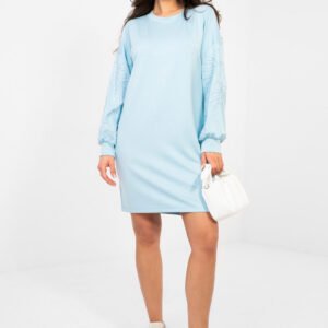 Sukienka dresowa o długości mini, która łączy wygodę z kobiecym stylem. Wykonana z wyjątkowo przyjemnego w dotyku materiału typu masełko miękkiego, delikatnego i otulającego skórę. Tkanina z wiskozy z dodatkiem elastanu zapewnia doskonałą przewiewność, elastyczność oraz idealne dopasowanie do sylwetki. Model z długim, bufiastym rękawem nadaje całości subtelnej lekkości i modowego charakteru. Ozdobny haft na rękawach stanowi efektowny detal, który przyciąga wzrok i podkreśla unikalny styl sukienki. Klasyczny, okrągły dekolt pięknie eksponuje szyję, a brak zapięcia sprawia, że model jest niezwykle komfortowy i łatwy do założenia. Sukienka posiada praktyczne kieszenie wsuwane w szwach bocznych, które zwiększają jej funkcjonalność, nie zaburzając linii fasonu. Dominujący wzór oraz dopracowane detale sprawiają, że to idealna propozycja zarówno na co dzień, jak i na spotkania w bardziej casualowym stylu.
