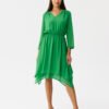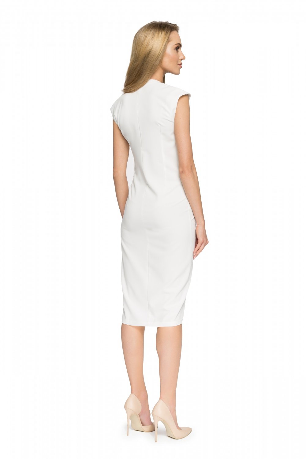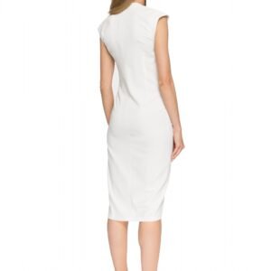 Ostre cięcia i dopasowany krój podkreślają kobiece kształty i przyciągają wzrok do tej oryginalnej sukienki z ozdobnymi guzikami.