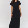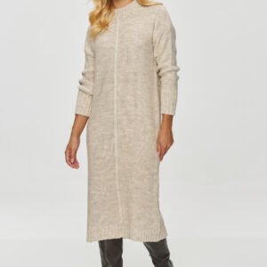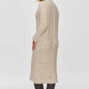 Długi sweter damski ma prosty, klasyczny krój, który sięga poniżej kolan, co sprawia, że jest idealny na chłodniejsze dni. Wykonany jest z grubszego, mięsistego materiału o widocznej strukturze dzianiny. Góra swetra ma zaokrąglony dekolt typu crew neck, a rękawy są długie i zakończone szerokim ściągaczem, co dodaje mu dodatkowej elegancji i ciepła. Wzór na swetrze jest minimalistyczny, bez dodatkowych zdobień, z wyjątkiem delikatnej pionowej linii biegnącej przez środek, która optycznie wydłuża sylwetkę. Ten sweter to idealna propozycja na zimowe dni, łączący w sobie komfort i styl. Może być noszony zarówno z wysokimi kozakami, jak i z bardziej casualowym obuwiem, co czyni go wszechstronnym elementem garderoby.