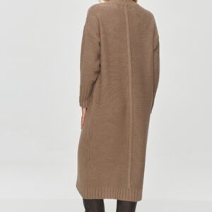 Długi sweter damski ma prosty, klasyczny krój, który sięga poniżej kolan, co sprawia, że jest idealny na chłodniejsze dni. Wykonany jest z grubszego, mięsistego materiału o widocznej strukturze dzianiny. Góra swetra ma zaokrąglony dekolt typu crew neck, a rękawy są długie i zakończone szerokim ściągaczem, co dodaje mu dodatkowej elegancji i ciepła. Wzór na swetrze jest minimalistyczny, bez dodatkowych zdobień, z wyjątkiem delikatnej pionowej linii biegnącej przez środek, która optycznie wydłuża sylwetkę. Ten sweter to idealna propozycja na zimowe dni, łączący w sobie komfort i styl. Może być noszony zarówno z wysokimi kozakami, jak i z bardziej casualowym obuwiem, co czyni go wszechstronnym elementem garderoby.