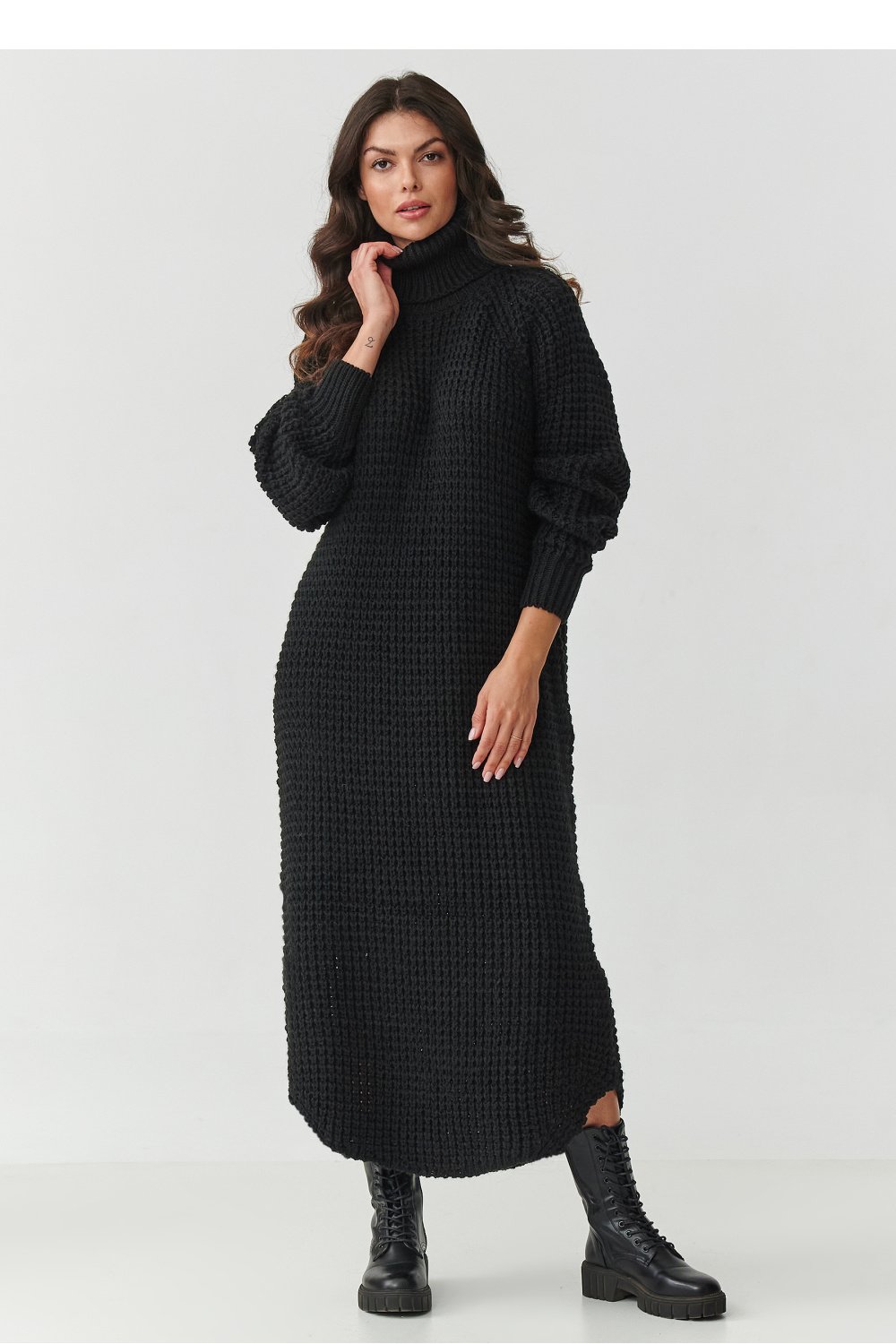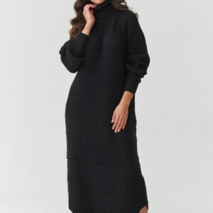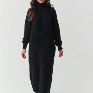 Zanurz się w jesienno-zimowy klimat z sukienką, która łączy modny design, wygodę i praktyczność. Sukienka swetrowa damska z wysokim golfem to propozycja, która sprawdzi się zarówno na co dzień, jak i w eleganckich stylizacjach. Uszyta z wysokiej jakości dzianiny, będącej połączeniem akrylu i poliamidu, jest miękka, przyjemna w dotyku i odporna na zniekształcenia. Dzięki temu zachowuje świetny wygląd nawet po wielu praniach, a jednocześnie otula ciepłem w chłodniejsze dni. Wysoki, otulający kołnierz chroni przed zimnem i dodaje stylu a długie rękawy i luźny krój zapewniają swobodę i wygodę noszenia. Fason midi wysmukla sylwetkę i pasuje do różnych typów figury natomiast rozcięcia po bokach nadają lekkości i podkreślają nowoczesny charakter. Ta sukienka swetrowa midi z golfem to must-have w każdej garderobie idealna do pracy, na spotkania czy zimowe spacery. Wystarczy zestawić ją z botkami lub kozakami, by stworzyć efektowną stylizację na każdą okazję.