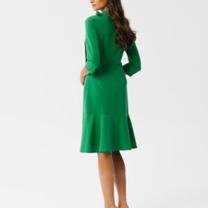 Ta urocza sukienka z ozdobnym wiązaniem i stójką to idealny wybór na wiele okazji. Rękawy 3/4 dodają jej lekkości, a długość w kolano sprawia, że jest uniwersalna. Z tyłu znajduje się falbana, która nadaje jej uroku. Sukienka jest bez podszewki, ale zamek kryty z tyłu ułatwia jej zakładanie. To sukienka, która została zaprojektowana i uszyta w Polsce, co świadczy o jej jakości i unikalności. Dodaje pewności siebie i stylu na różne okazje.