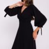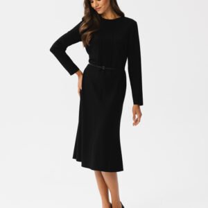 Ta sukienka wyróżnia się dekoracyjnymi przeszyciami na dekolcie, które dodają jej uroku. Odcięcie w talii podkreśla talię, a dołączony pasek ze sztucznej skóry jest stylowym dodatkiem. Długie, proste rękawy są uniwersalne i modne. Dół sukienki jest krojony ze skosu z przeszyciem przez środek, co nadaje jej lekkości. Długość za kolano sprawia, że sukienka jest odpowiednia na wiele okazji. Zamek kryty z tyłu ułatwia jej zakładanie. Sukienka jest bez podszewki, co zapewnia komfort noszenia. To sukienka, która została zaprojektowana i uszyta w Polsce, co świadczy o jej jakości i unikalności. Dodaje pewności siebie i stylu na różne okazje.