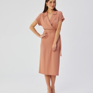 Sukienka o wyjątkowym kroju i doskonałym wykonaniu, stworzona z delikatnej tkaniny, łączy w sobie elegancję i funkcjonalność. Jej kopertowa góra z kołnierzykiem nadaje stylizacji subtelności, a zarazem podkreśla kobiecy urok. Krótkie kimonowe rękawy dodają sukience lekkości i nowoczesności. Prosty fason sukienki, wyposażony w pasek do przewiązania w talii, umożliwia dostosowanie do indywidualnych upodobań, a zarazem subtelnie podkreśla kobiece krągłości. Z tyłu, na wysokości talii, znajduje się elastyczna guma, co gwarantuje wygodę noszenia i doskonałe dopasowanie sukienki do sylwetki. Długość midi nadaje sukience uniwersalność, sprawiając, że jest odpowiednia zarówno na spotkania formalne, jak i bardziej swobodne okazje. Brak podszewki pozwala tkaninie delikatnie układać się na ciele, zachowując jednocześnie lekkość i przewiewność. Z tyłu sukienki umieszczono rozcięcie, które nadaje całości subtelny akcent i dodatkowo ułatwia ruch. To nie tylko elegancki element garderoby, ale również wyraz wsparcia dla polskiego designu, ponieważ sukienka została zaprojektowana i uszyta w Polsce, co podkreśla jej wysoką jakość i lokalny charakter.