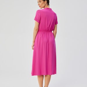 Sukienka z wysokiej jakości tkaniny wiskozowej, wykonana w całości w Polsce, to połączenie elegancji, komfortu i lokalnego rzemiosła. Tkanina wiskozowa w 100% gwarantuje miękkość, delikatność i przyjemność noszenia, tworząc przy tym lekko rozkloszowany fason sukienki. W talii sukienka jest ściągana paskiem, co pozwala na subtelne podkreślenie kobiecych kształtów i dostosowanie jej do indywidualnych preferencji. Górna część sukienki jest rozpinana, co ułatwia zakładanie i zdejmowanie oraz dodaje elementu praktyczności. Pod szyją znajduje się stójka, co nadaje sukience wyrafinowanego charakteru. Krótkie rękawy z delikatnym wywinięciem dodają sukience lekkości i świeżości, idealnie komponując się z letnimi stylizacjami. Warto zaznaczyć, że sukienka nie posiada podszewki, co sprawia, że tkanina doskonale układa się na ciele, zachowując przy tym lekkość i przewiewność. Projektowanie i szycie w Polsce podkreśla lokalną produkcję, co jest dodatkowym atutem dla świadomych konsumentów ceniących wysoką jakość i wsparcie dla miejscowego rzemiosła.