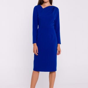 Elegancka sukienka z tkaniny o prostym, ołówkowym fasonie, idealna na różne okazje. Długie rękawy i odcięcie w pasie subtelnie podkreślają sylwetkę, nadając jej klasycznego wyglądu. Sukienka wyróżnia się asymetrycznym dekoltem z zakładką, który dodaje oryginalności i nowoczesnego stylu. Długość za kolano oraz rozcięcie z tyłu u dołu zapewniają swobodę ruchu i elegancję. Z tyłu znajduje się kryty zamek, co zapewnia dyskretne zapięcie. Sukienka bez podszewki, co czyni ją lekką i wygodną. Zaprojektowana i uszyta w Polsce, to propozycja dla kobiet ceniących szyk i prostotę.