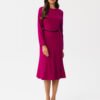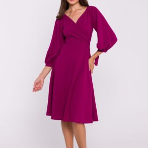 Romantyczna sukienka wykonana z miękkiej dzianiny, łączy kobiecy styl z wyjątkowym komfortem noszenia. Góra o kopertowym kroju pięknie podkreśla dekolt w kształcie litery V, z opcją opuszczenia na ramiona, co nadaje zmysłowego i subtelnego wyglądu. Na ramionach wszyte są elastyczne wstawki z gumy, które zapewniają wygodę i stabilność. Bufiaste rękawy zakończone regulowanym wiązaniem pozwalają na dostosowanie długości do indywidualnych preferencji. Sukienka nie posiada podszewki, dzięki czemu jest lekka i przewiewna, a kryty zamek z tyłu zapewnia estetyczne dopasowanie. Długość za kolano sprawia, że jest idealna na różne okazje. Zaprojektowana i uszyta w Polsce, zachwyca jakością wykonania i dbałością o detale.