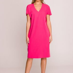Sukienka o luźnym fasonie, który zapewnia swobodę ruchów i komfort przez cały dzień. Długość w kolano sprawia, że jest to uniwersalny wybór na wiele okazji. Krótkie rękawy dodają lekkości, idealnie sprawdzając się w cieplejsze dni. Dekolt w kształcie litery V subtelnie eksponuje szyję, nadając sukience kobiecego charakteru. Kryty zamek z tyłu zapewnia wygodę w zakładaniu, a dodatkowy rozporek na dole z tyłu wprowadza odrobinę eleganckiego akcentu. Sukienka jest bez podszewki, co czyni ją jeszcze bardziej przewiewną i wygodną. Zaprojektowana i uszyta w Polsce, co gwarantuje wysoką jakość wykonania oraz dbałość o detale. To doskonały wybór dla kobiet ceniących styl, wygodę i elegancję w codziennych stylizacjach.