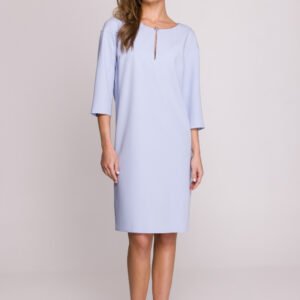 Luźna i wygodna sukienka o swobodnym kroju, sięgająca przed kolano. Posiada rękawy o długości 3/4 oraz dekolt z subtelnym przecięciem, ozdobionym eleganckim guzikiem. Z tyłu zapinana na kryty zamek, a na dole znajduje się delikatny rozporek, zapewniający większą swobodę ruchów. Model bez podszewki, idealny na różne okazje. Sukienka została zaprojektowana i uszyta w Polsce z wysokiej jakości tkaniny, która gwarantuje komfort noszenia i stylowy wygląd.
