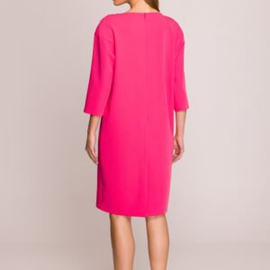 Luźna i wygodna sukienka o swobodnym kroju, sięgająca przed kolano. Posiada rękawy o długości 3/4 oraz dekolt z subtelnym przecięciem, ozdobionym eleganckim guzikiem. Z tyłu zapinana na kryty zamek, a na dole znajduje się delikatny rozporek, zapewniający większą swobodę ruchów. Model bez podszewki, idealny na różne okazje. Sukienka została zaprojektowana i uszyta w Polsce z wysokiej jakości tkaniny, która gwarantuje komfort noszenia i stylowy wygląd.