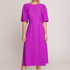 Romantyczna i kobieca sukienka midi o lekko rozkloszowanym fasonie, który pięknie układa się w ruchu. Klasyczny okrągły dekolt z przodu oraz subtelne wycięcie w kształcie litery V z tyłu dodają jej elegancji. Krótkie bufiaste rękawy na podszewce nadają sukience delikatnego, stylowego charakteru. Góra również została podszyta, co zapewnia komfort noszenia i idealne dopasowanie. Model zapinany na kryty zamek z tyłu, dzięki czemu całość prezentuje się niezwykle estetycznie. Sukienka zaprojektowana i uszyta w Polsce, z dbałością o każdy detal. Idealna na wyjątkowe okazje, jak i na co dzień w stylu pełnym klasy.
