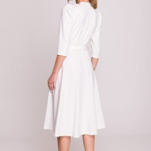Elegancka i komfortowa sukienka z dzianiny modalowej, która doskonale łączy wygodę z kobiecym stylem. Model z dopasowaną górą i dekoltem w kształcie litery V subtelnie podkreśla sylwetkę, a wiązanie w talii pozwala na idealne dopasowanie do figury. Lekko rozkloszowany dół nadaje sukience lekkości i swobody ruchu. Klasyczna długość do kolan oraz rękawy 3/4 czynią ją uniwersalnym wyborem na różne okazje. Sukienka zakładana przez głowę, bez zbędnych zapięć, co zapewnia komfort noszenia. Zaprojektowana i uszyta w Polsce, z najwyższej jakości dzianiny modalowej miękkiej, oddychającej i przyjemnej dla skóry.