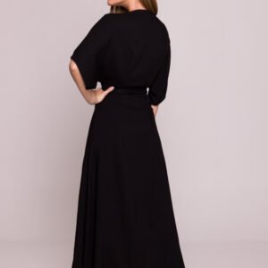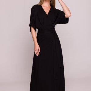 Ta lekka i zwiewna sukienka została uszyta z wysokiej jakości wiskozy, której satynowe wykończenie nadaje jej delikatny, subtelny połysk. Swobodny fason z rozkloszowanym dołem podkreśla kobiecą sylwetkę, a wiązanie w talii pozwala na idealne dopasowanie i podkreślenie kształtów. Dekolt w kształcie litery V subtelnie eksponuje szyję, a luźne rękawy sięgające przed łokieć zapewniają komfort noszenia i swobodę ruchów. Sukienka jest pozbawiona podszewki i kieszeni, co podkreśla jej lekkość i minimalistyczny charakter. Przód ozdabia efektowne rozcięcie, które dodaje stylizacji nuty lekkości i zmysłowości. Produkt zaprojektowany i uszyty w Polsce, łączący w sobie wygodę i elegancję, idealny na letnie dni i wieczorne wyjścia.
