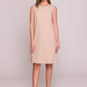 Elegancka sukienka wykonana z gładkiej, lekko elastycznej tkaniny z satynowym wykończeniem, która delikatnie lśni i nadaje całości wyjątkowego charakteru. Model z okrągłym dekoltem pod szyję ozdobionym metalowym detalem, który dodaje subtelnej elegancji. Sukienka bez rękawów, zapinana na kryty zamek z tyłu, co zapewnia wygodę noszenia i minimalistyczny wygląd. Fason prosty, trapezowy, swobodny i nieopinający sylwetki, idealny na co dzień i do biura. Sukienka ma podszewkę, która zwiększa komfort i trwałość ubrania. Długość przed kolano podkreśla kobiecą sylwetkę, jednocześnie zapewniając swobodę ruchów. Zaprojektowano i uszyto w Polsce.