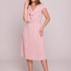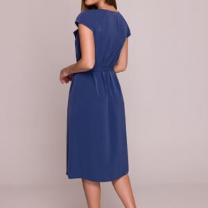 Elegancka sukienka o delikatnie rozkloszowanym fasonie w kształcie litery A, sięgająca midi, tuż do lub lekko za kolana. Wykonana z gładkiego materiału z subtelnym połyskiem, który dodaje jej wyjątkowego blasku. Dekolt w kształcie litery V ozdobiony jest dekoracyjną falbaną, która podkreśla kobiecość i nadaje lekkości. Krótki, opadający rękaw świetnie dopełnia całość, zapewniając komfort noszenia. Sukienka zapinana jest na kryty zamek z boku, co zapewnia schludny wygląd i wygodę. W talii znajduje się materiałowy pasek do wiązania, który pozwala na efektowne podkreślenie sylwetki. Sukienka nie posiada podszewki ani kieszeni. Produkt zaprojektowany i uszyty z dbałością o detale w Polsce.