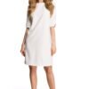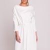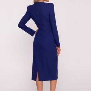 Szykowna sukienka o ołówkowym fasonie, uszyta z gładkiej tkaniny o strukturze melanżowej. Klasyczny, okrągły dekolt i długie, proste rękawy nadają całości elegancji, a poduszki wszyte w ramionach subtelnie podkreślają sylwetkę, tworząc nowoczesną, wyrazistą linię. Dopasowany krój lekko zwężany ku dołowi pięknie modeluje figurę, a wysokie rozcięcie z tyłu zapewnia swobodę ruchów i dodaje zmysłowego charakteru. Sukienka w całości wykończona podszewką doskonale się układa i gwarantuje wygodę noszenia. Długość za kolano sprawia, że to idealny wybór zarówno do stylizacji biznesowych, jak i na bardziej formalne okazje. Kryty zamek z tyłu zapewnia estetyczne wykończenie. Zaprojektowano i uszyto w Polsce.