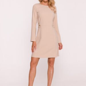Elegancka sukienka uszyta z gładkiej tkaniny o miękkim wykończeniu, która pięknie układa się na sylwetce. Klasyczny, zaokrąglony dekolt oraz długie rękawy nadają jej ponadczasowy charakter. Dopasowana góra subtelnie podkreśla talię, zaakcentowaną dodatkowymi patkami z ozdobnymi złotymi guzikami. Dół w kształcie delikatnej litery A lekko rozszerza się ku dołowi, tworząc trapezowy fason, który łączy elegancję z komfortem noszenia. Kryty zamek z tyłu zapewnia wygodę i estetyczne wykończenie, a długość przed kolano czyni tę sukienkę idealną zarówno na spotkania biznesowe, jak i bardziej formalne okazje. Zaprojektowano i uszyto w Polsce.