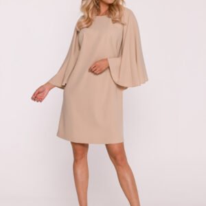 Elegancka sukienka o fasonie trapezowym, wykonana z gładkiej, przyjemnej w dotyku tkaniny. Model wyróżnia się efektownymi, szerokimi rękawami typu nietoperz o długości 3/4, które nadają całości lekkości i subtelnego charakteru. Półokrągły dekolt podkreśla kobiecą sylwetkę w delikatny sposób, a swobodna talia zapewnia wygodę noszenia i nie opina figury. Dół sukienki jest prosty, co w połączeniu z luźną górą tworzy harmonijną, elegancką całość. Sukienka zapinana jest na kryty zamek z tyłu, dzięki czemu prezentuje się wyjątkowo estetycznie. Długość mini przed kolano, dodaje jej nowoczesnego charakteru, czyniąc ją idealnym wyborem zarówno na eleganckie przyjęcia, jak i mniej formalne spotkania. Zaprojektowano i uszyto w Polsce z dbałością o każdy detal.