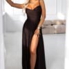 Długa suknia z dekoltem, rozcięciem na nogę i przeszyciami w pasie. Uszyta z elastycznego materiału z brokatem w kolorze granatowym. Idealna na wesela, sylwestra, studniówkę czy karnawał. Produkt polski. Marka numoco.
