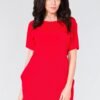 Elegancka sukienka z dzianiny z kieszeniami na biodrach. Fason tuba. Rękawy oraz dekolt wykończony ściągaczem. Dół sukienki pozostawiony w stanie surowym. Rękaw 3/4.
