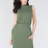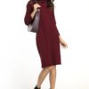 Elegancka sukienka z dzianiny. Podkroje pach wykończone cienkim ściągaczem. Na tyle ozdobna łezka wykończona przedłużoną lamówką wiązaną na kokardkę.