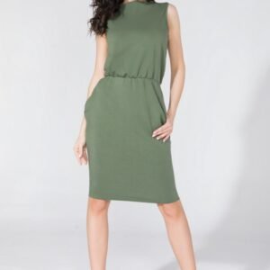 Sukienka z dzianiny o fasonie maskującym niedoskonałości sylwetki. Na biodrach kieszenie w szwie. W talii delikatnie ściągnięta. Dół oraz dekolt pozostawiony w stanie surowym.
