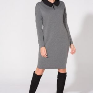 Sukienka o szerokim fasonie z kieszeniami na biodrach. Dół, rękaw oraz dekolt pozostawione w stanie surowym. Do sukienki dołączony jest kołnierzyk nadający szyku i elegancji.