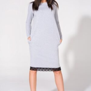 Sukienka z dzianiny dresowej. Na tyle ozdobna łezka z satynową tasiemką wiązaną na kokardkę. Dół wykończony koronką, a rękaw pozostawiony w stanie surowym. Na biodrach kieszenie w szwie.
