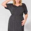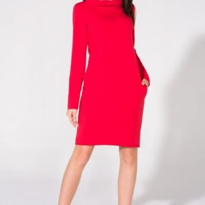Sukienka z dzianiny z kominem. Na biodrach kieszenie w szwie. Dół oraz rękaw pozostawiony w stanie surowym.