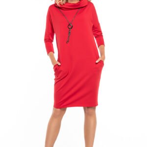 Sukienka o luźnym kroju z kieszeniami na biodrach. Sukienka z dekoltem w łódkę i rękawem 3/4.