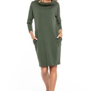 Sukienka o luźnym kroju z kieszeniami na biodrach. Sukienka z dekoltem w łódkę i rękawem 3/4.