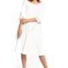 Elegancka sukienka ściągnięta w pasie z podwójną spódnicą. Góra sukienki ma luźny fason, typu kimono, natomiast dół sukienki jest lekko rozkloszowany. Nasze rozwiązanie dołu z podwójną spódnicą pozwala jej na piękne zachowanie się w trakcie ruchu. Do sukienki dołączamy pasek, z możliwością przewiązania lub zawiązania na kokardę. Nasza propozycja na specjalne okazje!