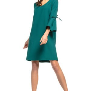 Prosta, luźna sukienka z fikuśną falbanką przy rękawach oraz subtelnym dekolcie w kształcie litery V. Sukienka ta jest naszą propozycją dla wszystkich tych pań, które nie lubią opiętych sukienek a jednocześnie lubią się czuć elegancko. Fason sukienki na pewno zatuszuje ewentualne niedoskonałości.