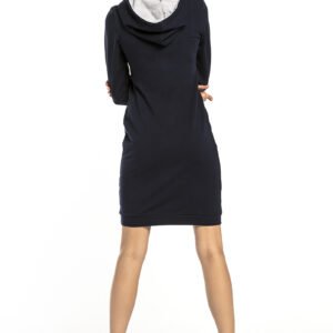 Dopasowana sukienka z przyjemnej w dotyku dzianiny dresowej z kapturem i długim rękawem. Środek kaptura wykończony kontrastowym kolorem. Przy rękawach i u dołu sukienki ściągacze. Nasza propozycja idealnie nadaje się do stylizacji codziennych jak i sportowych.