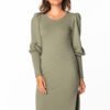 Sukienka midi wykonana z przytulnej bawełnianej dzianiny z szerokim dekoltem w łódkę i rękawem 3/4. Górna część sukienki ma kimonowy krój, dół ma ołówkowy krój. Dodatkowo ozdobny dzianinowy pasek w kolorze sukienki. Materiał jest elastyczny. Nasza propozycja na każdy dzień.