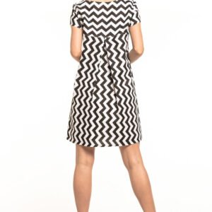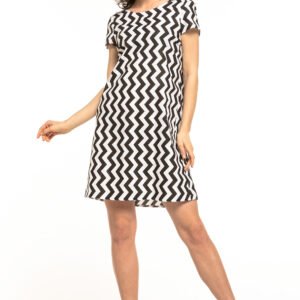 „Sukienka mini z dekoltem w łódkę z krótkim rękawem. Ta sukienka ma podwójną kontrafałdę z tyłu. Ten uroczy krój pozwoli ci poczuć się dziewczęco, a luźny krój nie ograniczy ruchów, a dodatkowo ukryje wszelkie potencjalne niedoskonałości ciała. Ta sukienka na pewno stanie się jedną z twoich ulubionych.”