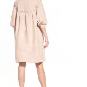 Sukienka midi z dekoltem w szpic, lekko marszczona na linii piersi z bufiastym rękawem 3/4 zakończonym mankietem.