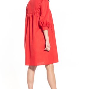Sukienka midi z dekoltem w szpic, lekko marszczona na linii piersi z bufiastym rękawem 3/4 zakończonym mankietem.