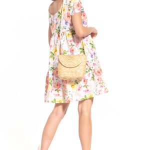 Mini sukienka w kwiatowy wzór z dekoltem łódkowym i krótkim rękawem.
