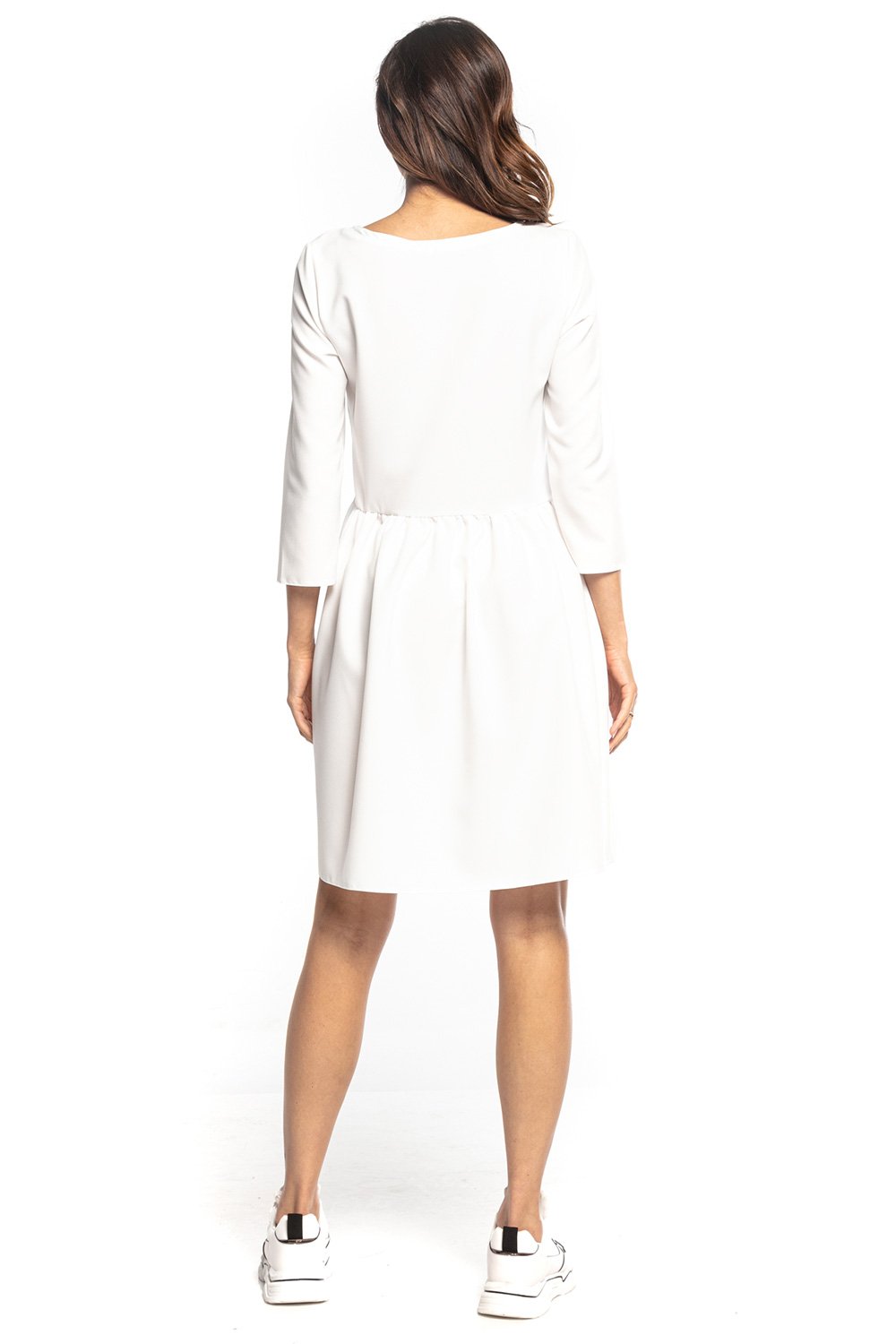 Sukienka midi z rękawem 3/4, marszczona w talii. Dół sukienki lekko rozkloszowany, góra bardziej dopasowana.