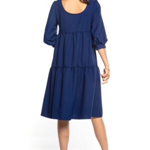 Sukienka z bufiastym rękawem 3/4 i dekoltem w łódkę. Sukienka wykonana z falbanek o rozkloszowanym kroju. Projekt z pewnością zakryje wszelkie potencjalne niedoskonałości ciała i nie ograniczy ruchu. Z tyłu głęboki dekolt.
